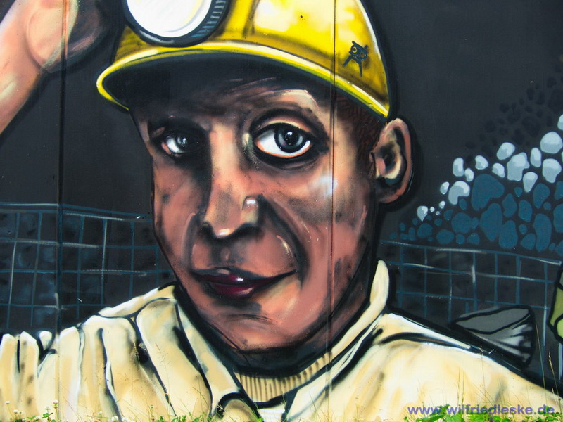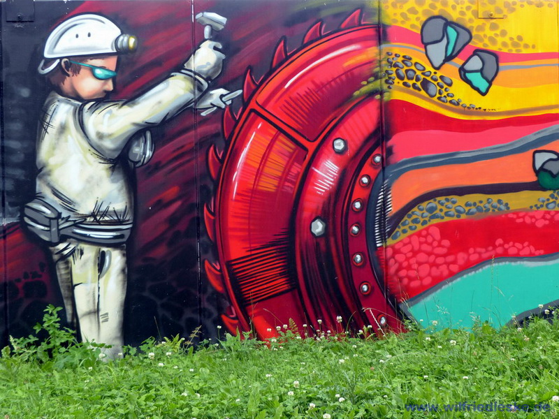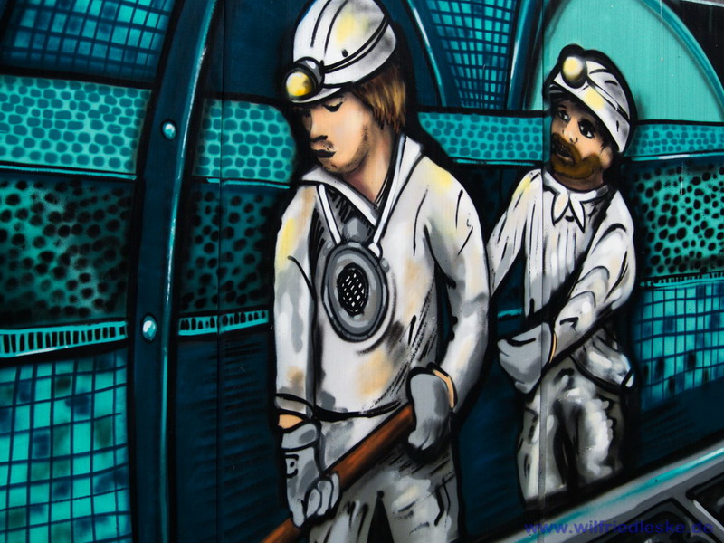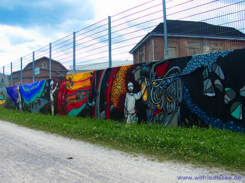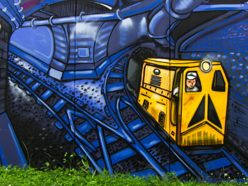 An einer Stelle des Radwegs hat man ein Stück Grubenausbau mit einer original Grubenlokomotive (mit Dieselantrieb) und zwei Loren aufgestellt. Erinnerung an die Bergbaugeschichte. In diesem Bereich wurde die alte Zechenmauer kunstvoll mit Graffitis bemalt, natürlich alles Bergbaumotive. Ein toller Punkt für die Rast während der Radtour.