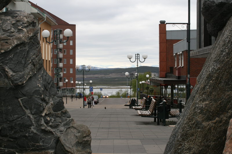 Wir parkten unser Wohnmobil in der Innenstadt von Kiruna. Da es Sonntag war, hatten die Geschäfte geschlossen. Nur in den Randbezirken hatten einige Supermärkte geöffnet. Dafür sah man aber von der Stadt aus auf das Erzbergwerk. Dort wurde auch am Sonntag gearbeitet. Jedenfalls staubte es bei der Aufbereitung ganz kräftig und auf den Bahngleisen herrschte reger Zugverkehr. Wir bummelten etwas durch die Stadt und zur Kirche, der schönsten Holzkirche, die ich jemals gesehen habe. Sowohl innen, als auch von außen eine Augenweide. Das Kirchengebäude erinnert an eine Lappenbehausung. Der nebenstehende Kirchturm ist fast zwiebelförmig. Es gibt in Kiruna aber noch andere Hingucker, wie den Turm des Rathauses oder diverse Plastiken, Kunstwerke und Denkmäler. Ich hatte den Eindruck, die Erzgesellschaft möchte die Bürger der Stadt etwas für die Unannehmlichkeiten entschädigen. Übrigens wurde die Kirche 1912 auch von der Bergwerksgesellschaft bezahlt.