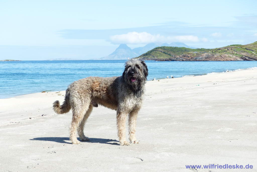 Wir standen ganz allein auf dem Parkplatz und konnten am nächsten Morgen auch den ganzen Strand für unseren Hundespaziergang benutzen. Die Sonne verdrängte zunehmend die Wolken und überraschender Weise konnten wir am Vormittag in kurzen Hosen und mit T-Shirt am Strand spazieren gehen und das Veloped testen. Amarok hatte endlich mal wieder richtig Auslauf und wir konnten den Blick auf Bodø und die vorbeifahrenden Hurtigruten Schiffe genießen.