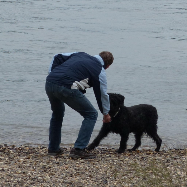 Flottmacher Nr.2 ist Wasser. So waren wir am vergangenen Wochenende am Rhein. Zunächst trottelte der alte Hund wieder hinter mir her, bis er das Wasser bemerkte. Da war er auf einmal wieder jung, rannte runter und wartete auf ein Stöckchen. Angesichts seiner verminderten Sehfähigkeit zog ich es aber vor, ihm nur Steinchen zu werfen. Ich wollte nicht, dass er auf der Suche nach dem schwimmenden Holz die Orientierung verliert.