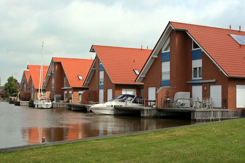 Für größeres Bild bitte klicken!Früher lebten die Menschen am Wasser um sich damit ihren Lebensunterhalt zu verdienen. Ob als Schiffer, Fischer oder Bootsbauer. Heute sind die genannten Berufe ausgestorben. Die Menschen leben allenfalls noch vom Tourismus. Ein besonders krasses Beispiel fand ich in Weener an der Ems. Im Marina Park wird ein Stück Lebensqualität der besonderen Art angepriesen: Wohnen, wo die Wellen sind.