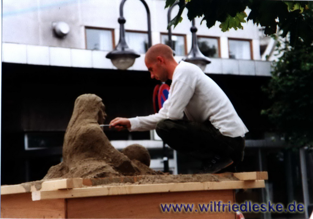 Stavanger: Ein Straßenkünstler moduliert eine Figur aus Sand