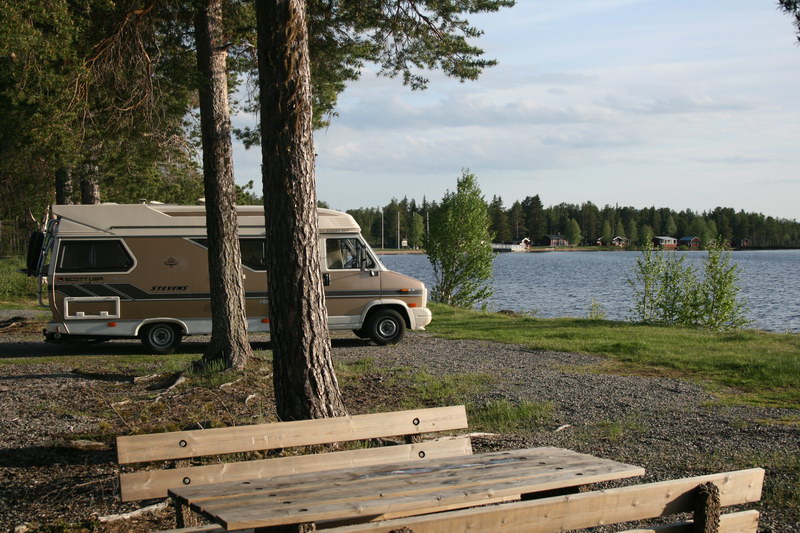 An diesem Tag machten wir wieder reichlich km durch Lappland. Wir sahen viele Rentiere auf und neben der Straße, 2 Füchse und 3 Kraniche. Einmal mussten wir durch eine „kleine" Baustelle fahren. Sie war „nur" 40 km lang und bestand aus einer reinen Schotterpiste. Dafür wurden wir durch einen tollen Rastplatz an einem See und strahlenden Sonnenschein entschädigt. Als Tagesziel erreichten wir den Polarkreis und fanden dort auch einen Stellplatz. Für 110 SKR hatten wir sogar Strom und waren ganz alleine.