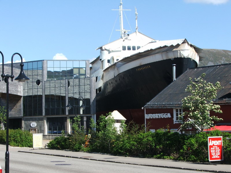 An nächsten Tag sollte es zügig nach Andenes gehen. Wir wollten an einer Walsafari teilnehmen und dazu musste man sich einen Tag vorher in eine Liste eintragen. In Stockmarknes hielten wir am Hurtigruten Museum. Hier wurde 1893 die weltberühmte Schiffsverbindung von Richard With gegründet. Neben der Straße steht die alte „MS Finnmarken" auf Land.
