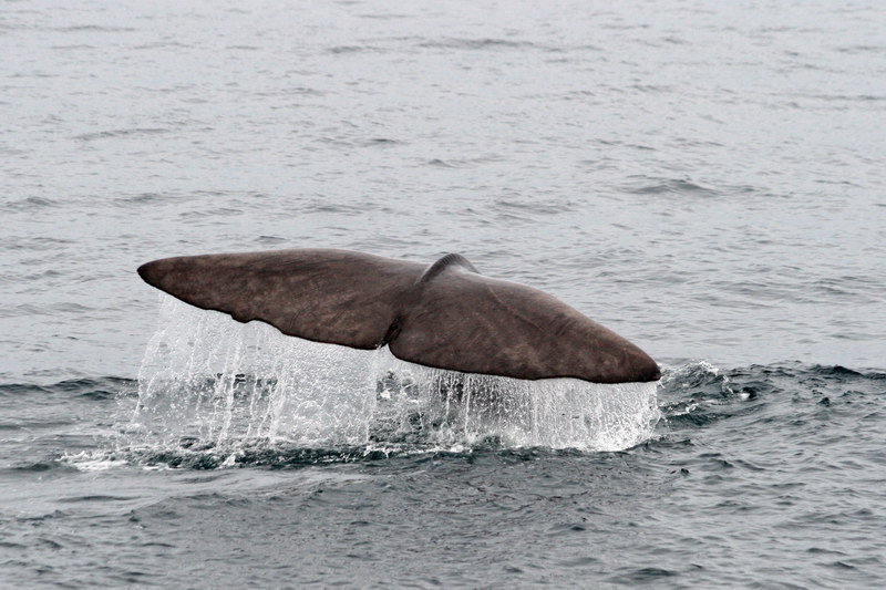 Vorsichtig fuhr der Kapitän näher ran. Glenn lag ruhig auf dem Wasser. Ab und zu blies er nach links aus. Man sah nur den Vorderteil seines Körpers bis zur Rückenflosse. Nach fünf oder sechs Minuten krümmte er den Rücken. Dann tauche er wieder ab und dabei kam seine Fluke für einen Moment aus dem Wasser - und das war genau der Moment, auf den alle Fotografen an Bord gewartet hatten. Gut, das ich schon vorher geübt hatte, die Kamera auf dem schaukelnden Schiff ruhig zu halten.