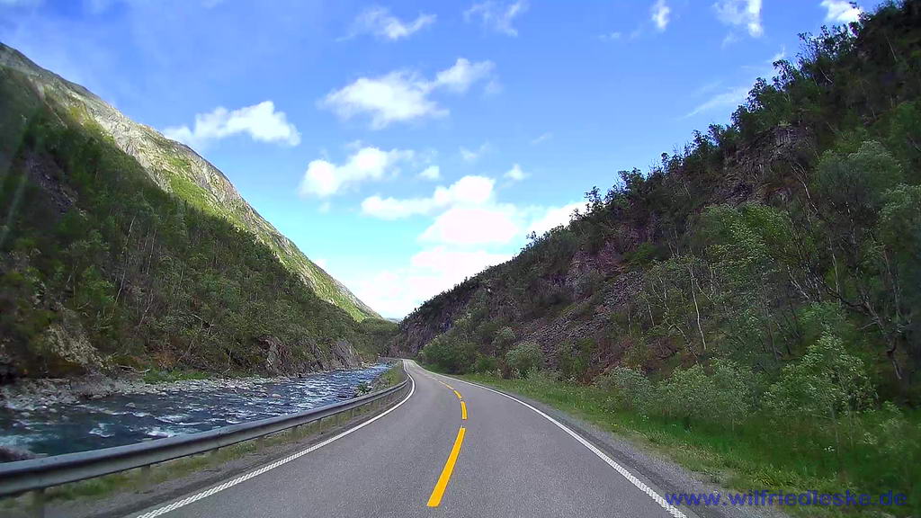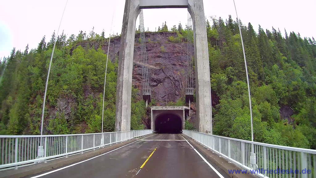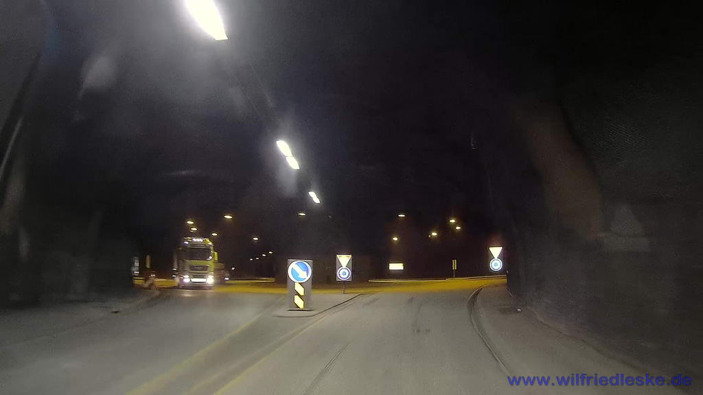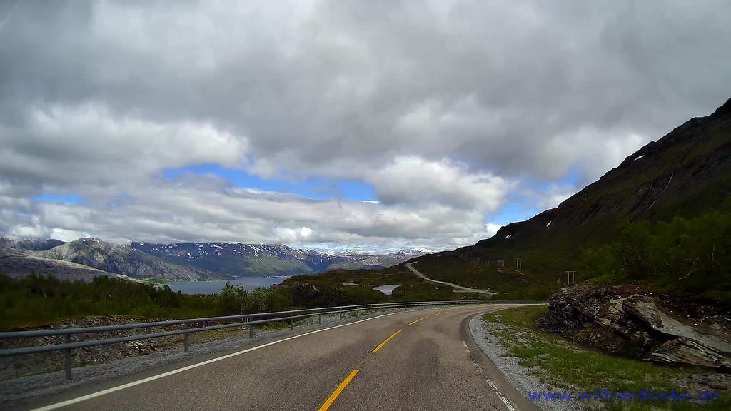 Kurz danach mussten wir die Küste verlassen und auf der Rv862 zunächst einen Berg hochfahren. Im Skalandtunnel fuhren wir schließlich unter dem Berg durch. Dieser fast 2 km lange Tunnel war einspurig und man musste bei entgegenkommenden Fahrzeugen rechtzeitig eine Ausweichstelle anfahren.