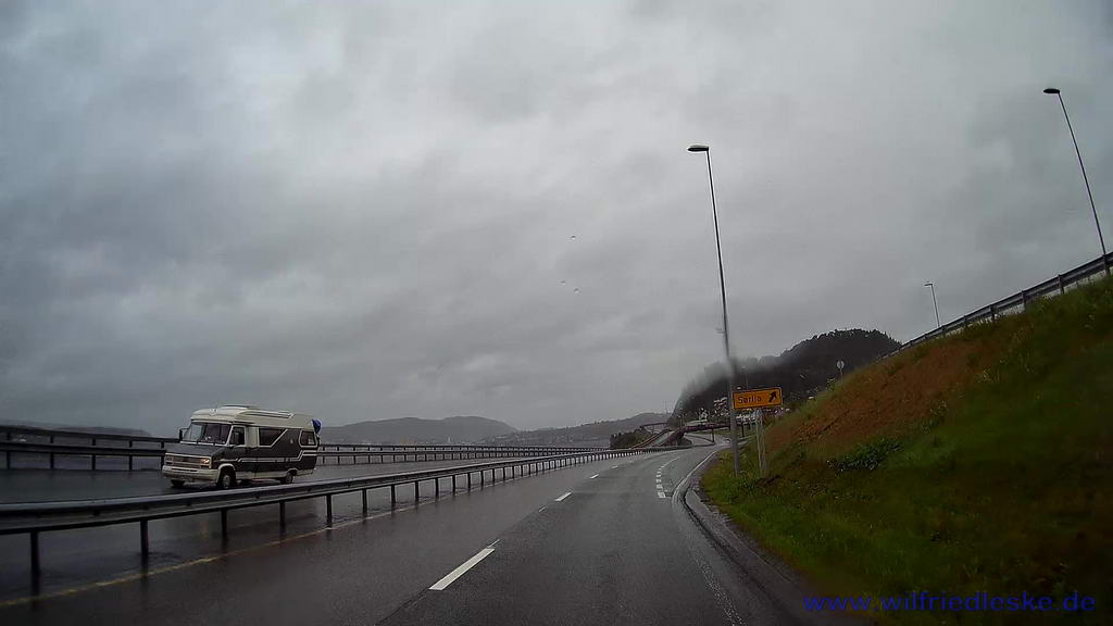 Die Pfahlhäuser haben wir aber nur von außen gesehen, da es die ganze Zeit regnete und wir auch keinen Parkplatz für unser Wohnmobil fanden. Je näher wir zu Küste kamen, desto gewagter waren die Bauwerke. Besonders interessant war bei Foldereid eine Brücke hoch über einen Fjord, die unmittelbar in einem Tunnel endete. Kurz danach erreichten wir in Holm den ersten Fährhafen unserer Route. Hier kauften wir uns zunächst die Ferjekort. Damit sollten sich die Fährkosten für uns deutlich reduzieren.