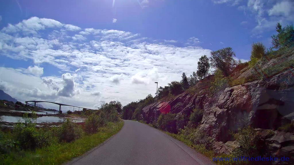 Wir nutzen einen Parkplatz in der Nähe für unsere Kuchenzeit und einen Spaziergang mit dem Hund. Anschließend hatten wir Gelegenheit, die Passage der Polarlys unter der Hadselbrua zu betrachten. Wir fuhren über die Brücke auf die Insel Langøya. 2009 hatten wir die östliche, schnellere Route benutzt. In diesem Jahr fuhren wir deshalb über die westliche Passage direkt an der Küste entlang.