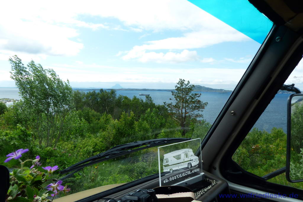 Am nächsten Morgen fuhren wir noch einmal zurück nach Sandnessjøen um einzukaufen. Danach ging es weiter nach Levang. Hier erwartete uns die nächste Fähre. Sie brachte uns nach Nesna. Der Himmel war heute immer noch bewölkt. Zwischendurch kamen aber immer größere blaue Flecken zum Vorschein. So umrundeten wir mit unserem Wohnmobil den Sjonafjord. Zwischendurch gab es immer schöne Aussichtspunkte, an den wir anhalten und die Aussicht genießen mussten.