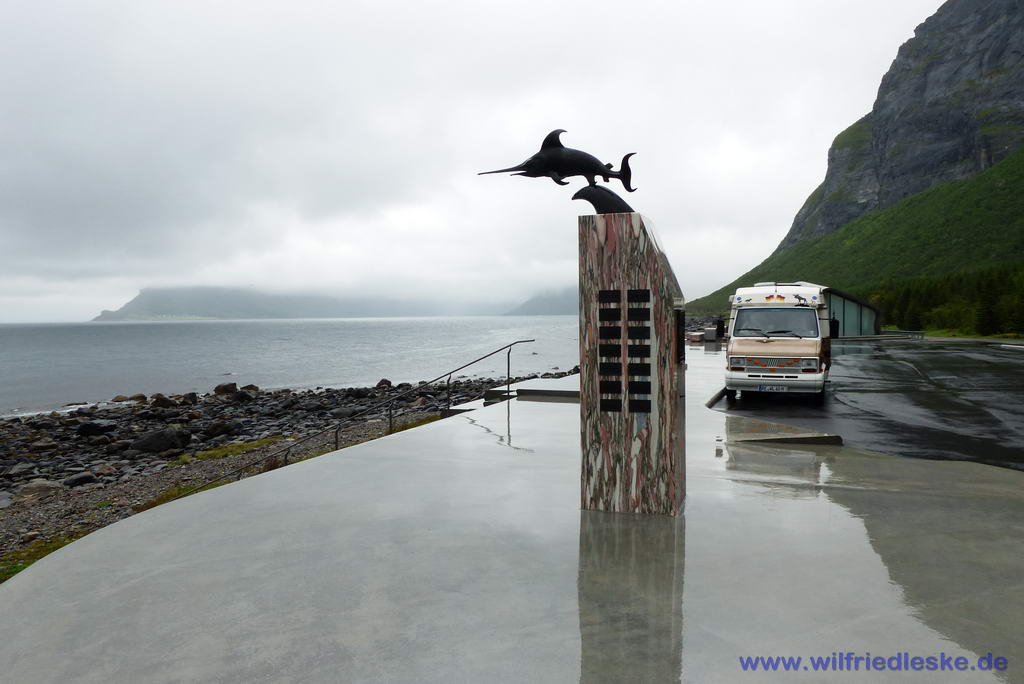 Wir durchfuhren den 7.900 Meter langen Svartisentunnel und folgen der Straße dann immer an der Küste entlang. Bei Grimstad hielten wir auf einem Parkplatz und bestaunten das Denkmal für ein gesunkenes deutsches U-Boot. Der Stein glänzte auf Grund des Regens wie Eis.