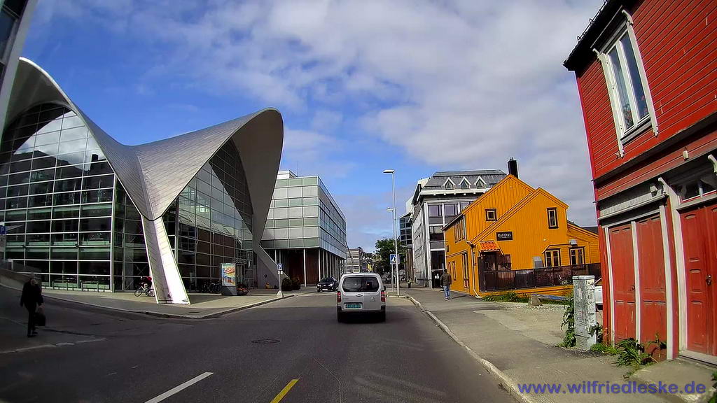 Die Fahrt durch die Innenstadt von Tromsø beeindruckte durch die Kombination von alten Holzhäusern und modernen Gebäuden aus Glas und Stahl. Wir sahen nur wenige Parkplätze, aber dafür immer wieder Parkhäuser in Tunneln.