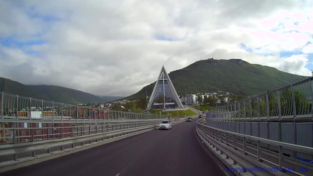 Über eine weitere große Brücke gelangten wir auf das Festland. Hier befinden sich weitere Stadtteile der größten Stadt Nordnorwegens und auch der Campingplatz. Bei der Fahrt über die Brücke schaut man direkt auf die Eismeerkathedrale und die Seilbahn Fjellheisen, die auf Storstein, den Hausberg von Tromsø, führt.
