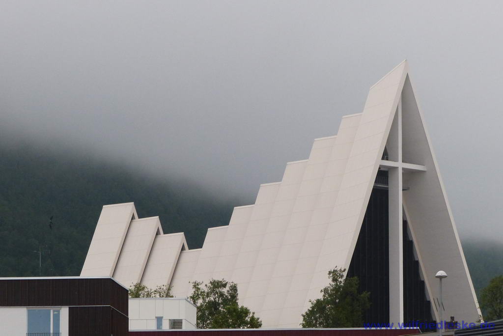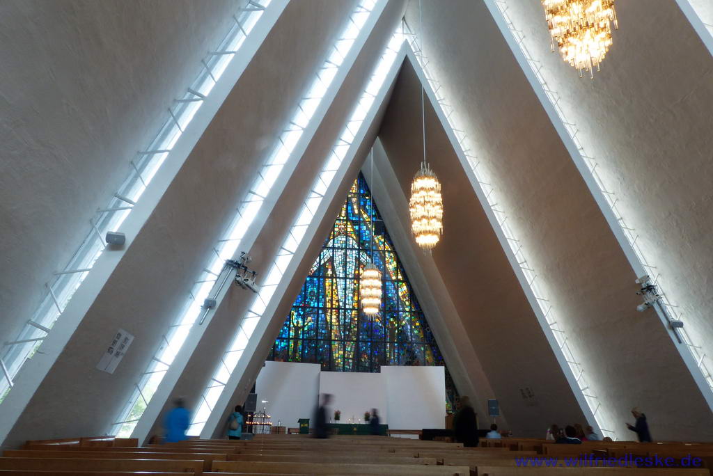 Von unserem Stellplatz blickten wir auch direkt auf die Eismeerkathedrale mit ihren bis auf den Boden reichenden Dachschrägen. Bei unserem Besuch der Kirche hatten wir Glück, da gerade ein Organist probte. So konnten wir die großartige Akustik live erleben. Aber auch ohne die musikalische Untermalung war der Besuch der Kirche ihr Eintrittsgeld wert.