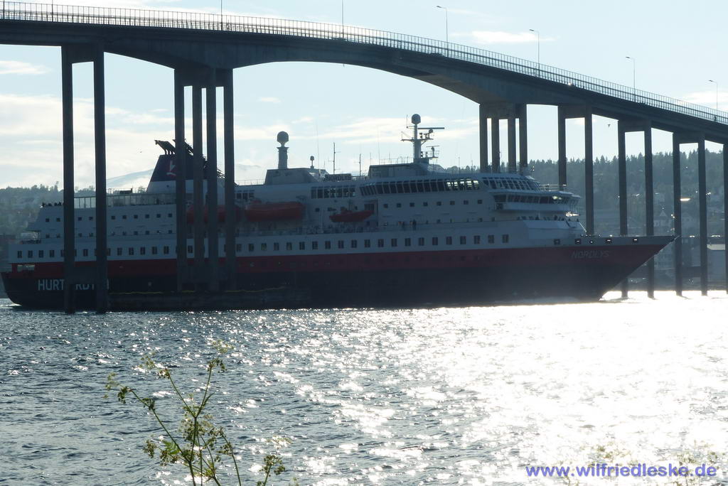 Auf der Fahrt zum Campingplatz sahen wir ein paar Wohnmobile auf einem großen Platz neben einer Baustelle stehen. Wir stellten uns dazu und hatten einen Übernachtungsplatz direkt am Ufer mit Blick auf die große Brücke und die Insel Tromsøya. Natürlich musste ich auch wieder ein Schiff der Hurtigrouten unter der Brücke fotografieren.