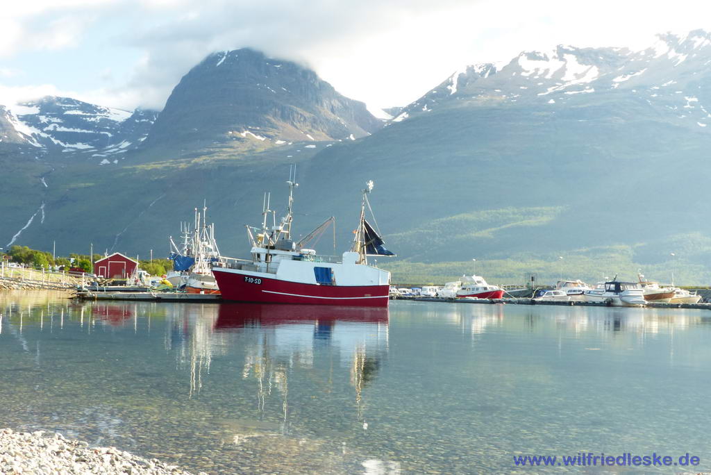 So fuhren wir zunächst ein gutes Stück an einem Fjord entlang. Zwischenzeitlich war der Himmel wieder grau. Aber zum Glück setzte sich die Sonne wieder durch. So konnten wir wieder interessante Lichtspiegelungen im Wasser sehen. Bei Skibotn fanden wir einen Parkplatz am Hafen. Hier am Lyngenfjord machten wir eine Pause und genossen noch einmal die Blicke auf das Wasser und die dahinterliegenden Berge. Kurz darauf würden wir das Nordmeer verlassen und durch das Landesinnere fahren.