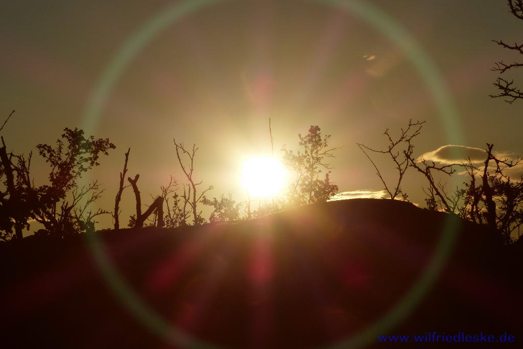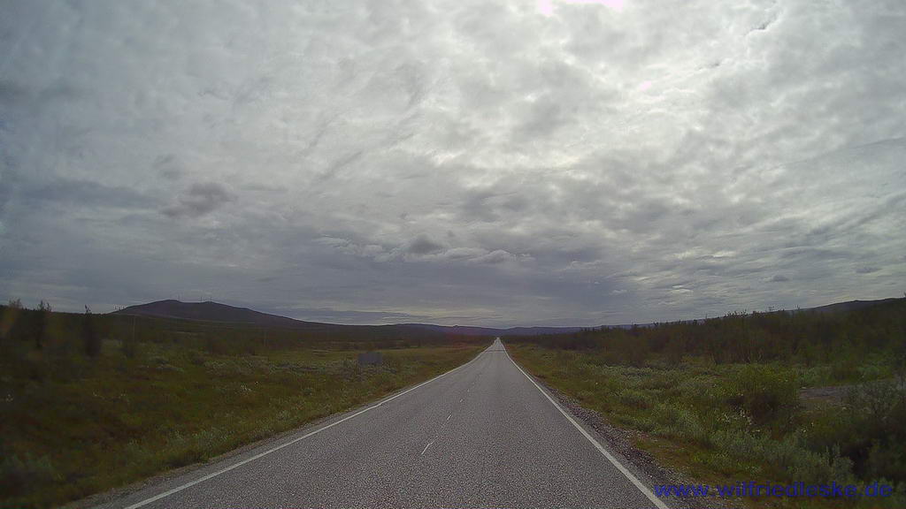 Kurz vor der finnischen Grenze übernachteten wir auf einen Rastplatz abseits der Hauptstraße. Auf unserer Fahrt von Skibotn hatten wir verschiedene Vegetationszonen durchquert. Hier im Grenzgebiet waren wir auf einer Hochebene und hatten erstmals Gelegenheit, die Mitternachtssonne mal nicht an einem Meer zu sehen. Ihr Licht tauchte die Fjell Landschaft in besonders warme Farben.