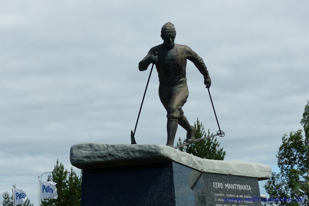 Und weiter ging es wieder über die schnurgerade Straße in Richtung Süden. Teilweise mussten wir über eine Schotterpiste fahren. In Pello fanden wir einen schönen Rastplatz für unsere Kuchenpause. Wir standen neben einer Statue, die Eero Mäntyranta zeigt, einen Skilangläufer aus dem Ort, der von 1960 bis 1968 mehrere Goldmedaillen bei Olympischen Spielen gewann.
