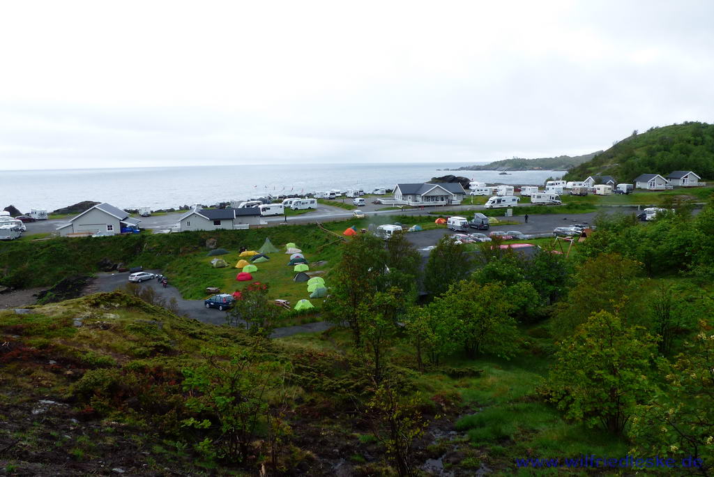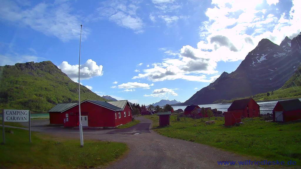 Der Himmel war immer noch bedeckt und sie Aussicht auf Mitternachtssonne gering. So beschlossen wir zur Insel Gimsøy zu fahren. Dort kannten wir einen kleinen Campingplatz mit Meerblick nach Norden. Auf Grund des schon seit Tagen bedeckten Himmels wollte ich unserer Aufbaubatterien mal wieder am Stromnetz aufladen und am Laptop Bilder sichern. Die Batterien hatten zwar noch 70% ihrer Kapazität, aber ich wusste ja nicht, wann wir wieder Sonne zum Laden haben würden.