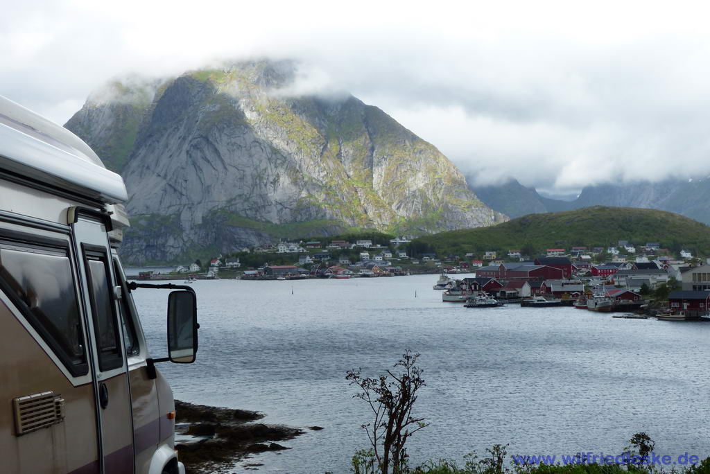 Egal, wir waren auf den Lofoten und mussten am nächsten Tag zunächst erst einmal einkaufen. Wir kannten uns ja aus und so fuhren wir nach Reine. Natürlich wollten wir auch wieder am Reinehalsen stoppen, um den Ort Reine mit der dahinter liegenden Gebirgskette und der Mündung des Reinefjords zu fotografieren. Aber der Parkplatz war voll. Egal, dann zunächst in den Ort zum Einkaufen. Aber wir fanden keinen Parkplatz. Also zurück und zum COOP auf der anderen Seite des Fjordes. Jetzt hatten wir wenigstens Glück und bekamen einen Parkplatz am Reinehalsen und konnten unser „Reinefoto“ machen; wenn auch ohne Bergspitzen. Am COOP gestaltete sich die Parkplatzsuche auch nicht viel einfacher. Mit Glück konnten wir unseren Hobby 600 parken und unseren Kuchen einkaufen.