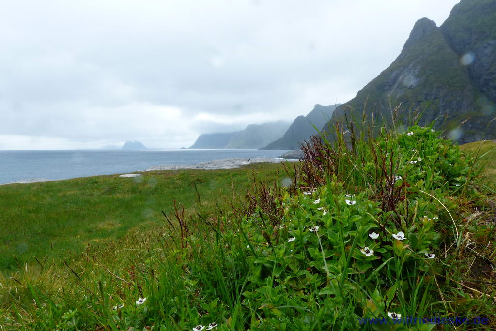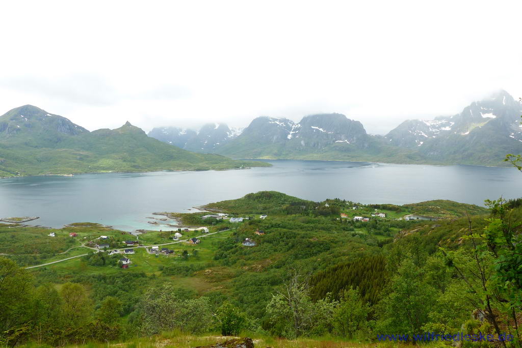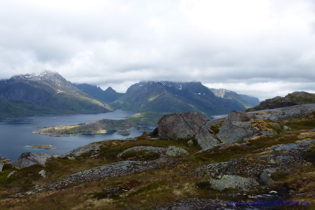 Am nächsten Morgen nieselte es leicht. Heute wollten wir die Insel Hinnøy erkunden. Aber zunächst kamen wir nur bis Digermulen. Der Regen hatte aufgehört und ich hatte Lust auf eine Wanderung. So machten wir uns auf dem „Kaiserweg" zum Digermulen- Gipfel. Eine leichte Wanderung, die wir 2008 schon mal gemacht hatten. Sie hat uns damals wegen der grandiosen Blicke, zunächst auf das gegenüberliegende Festland und weiter oben auf den Raftsund und die Gebirgskette des Trolltindan, begeistert. Leider sahen wir in diesem Jahr die Gipfel der Berge nicht. Nur ab und zu fanden ein paar Sonnenstrahlen den Weg durch die Wolkendecke. Sie sorgten dann für schöne Farbspiele.