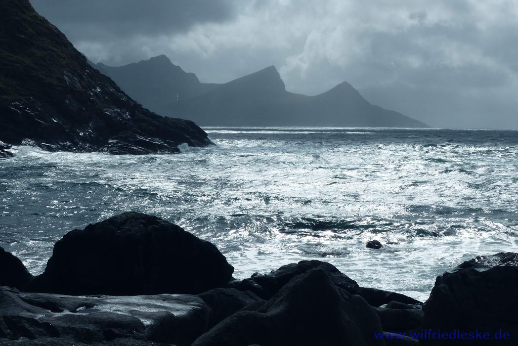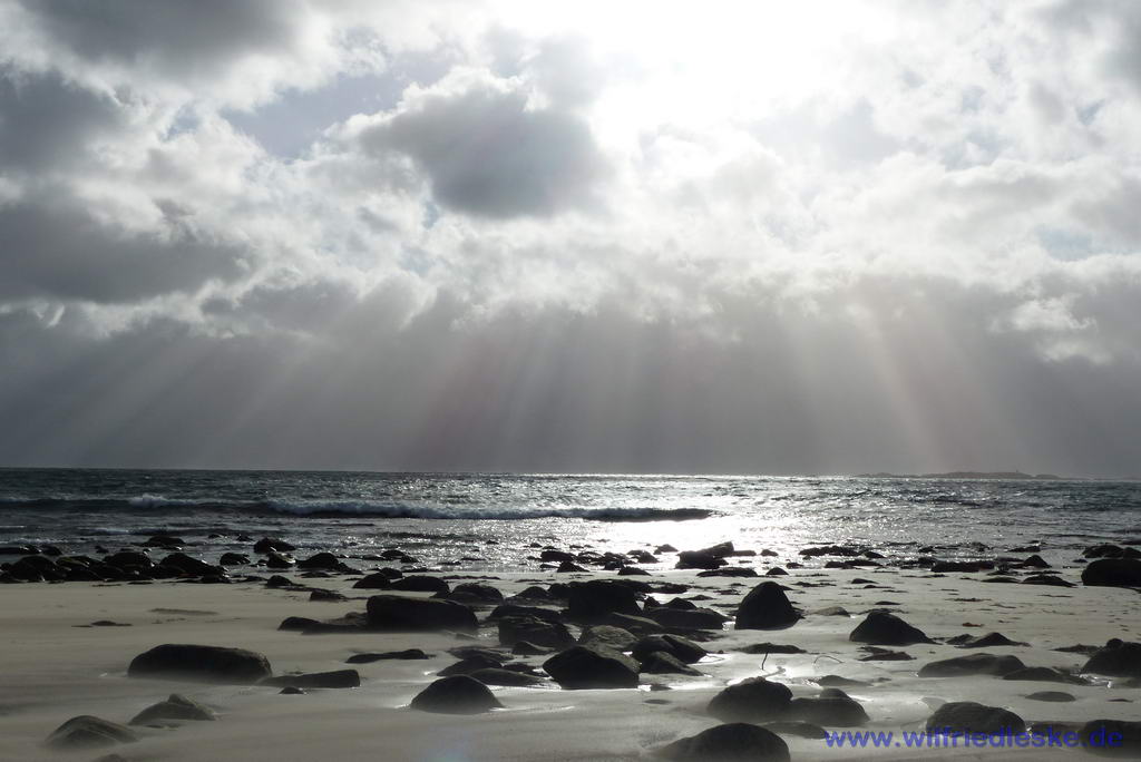 Ich packte das Regenzeug in den Rucksack und wanderte mit Amarok über die alte Küstenstraße nach Haukland Beach. Unterwegs blieb es trocken und die Sonne schaffte es kurzzeitig durch die Wolken und sorgte so auf dem Wasser für schöne Lichtspiele. Bei dem Wind war ich froh, wieder im schützenden Wohnmobil zu sein. Mir taten nur die Wanderer leid, die ihre Zelte am Strand aufgebaut hatten.