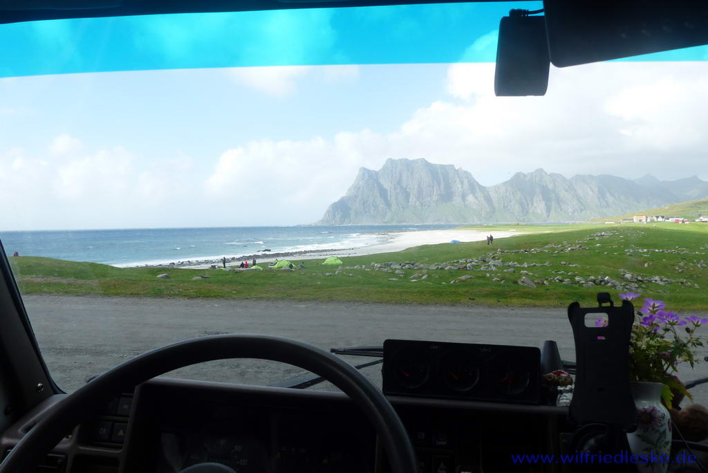 Kurz danach verließen wir Flakstadøya wieder und fuhren über die die E10 auf die Insel Vestvagøy. Hier steuerten wir Uttakleiv Beach an. Die Straße dort hin war sehr schmal und führte zum Schluss durch einen über einen Kilometer langen, einspurigen Tunnel. Dafür war der Verkehr gering und die Aussicht super. Vor dem Tunnel liegt Haukland Beach mit einem weiten Sandstrand. Uttakleiv besteht nur aus 6 Häusern und einem kleinen Campingplatz. Diesen steuerten wir dann auch an und suchten uns einen Platz am Berghang. Nach der letzten Nacht wollten wir dem Wind möglichst wenig Angriffsfläche bieten.
