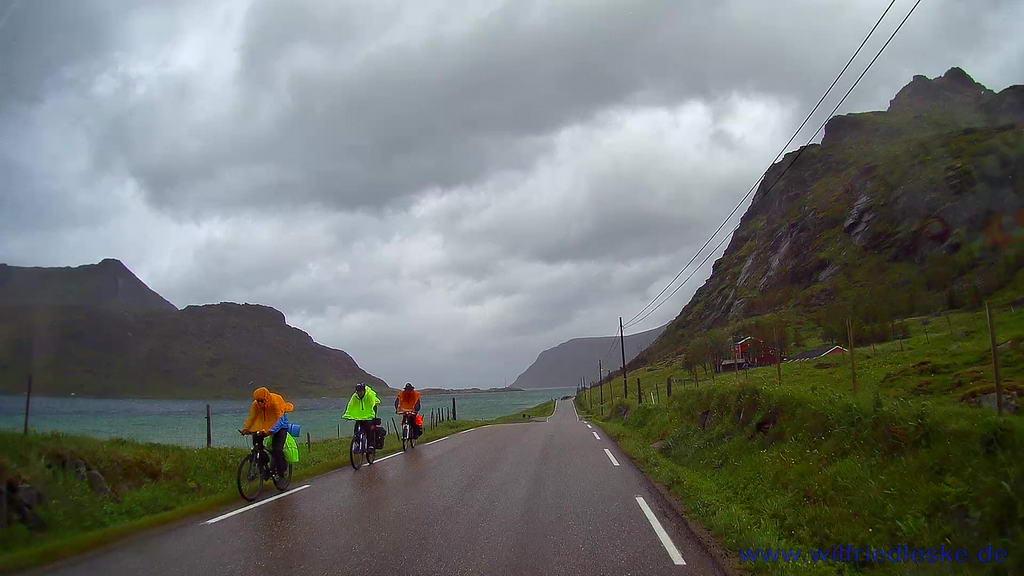 Nach dem Frühstück fuhren wir zunächst nach Leknes zum Einkaufen. Der Wind war immer noch sehr heftig und es regnete. Wir staunten über die vielen Radfahrer, die dennoch hier unterwegs waren. Darunter sahen wir auffallend viele junge Frauen. Nur die Harten kommen in den Garten.