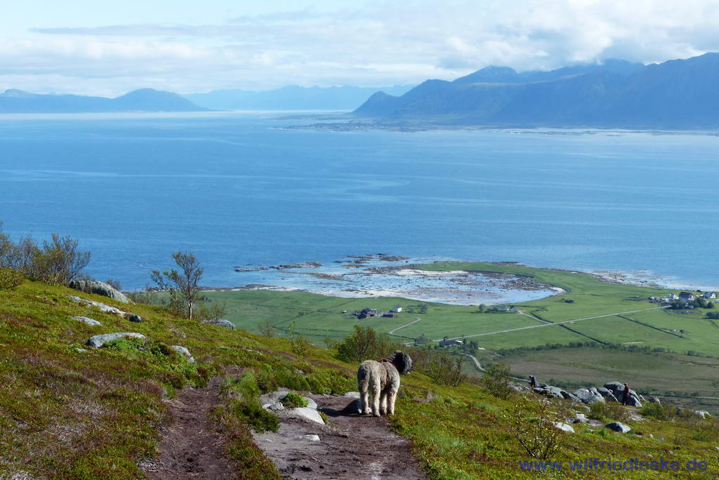 Nach dem Frühstück wanderte ich mit Amarok auf den 368 m hohen Hovden. Auf diesem Berg war ich 2009 schon mal mit Giovanni. Vom Gipfel und natürlich auch während der Wanderung hat man eine schöne Aussicht auf die Lofoten und die Vesterålen. Während der Wanderung merkte ich halt doch, dass man älter wird. Dazu kam mein Handicap durch die gebrochene Hand. Aber ich hatte ja unseren Zughund dabei, der mich bergauf ganz wunderbar unterstützte.
