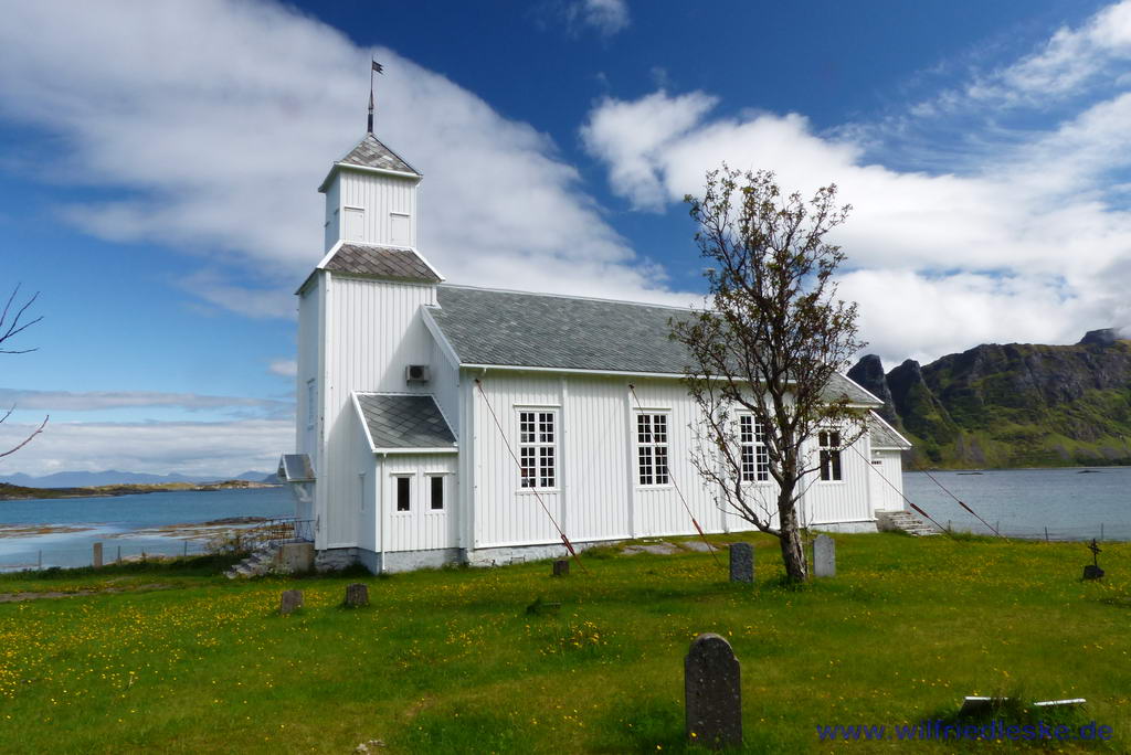 Nach der Wanderung setzten wir die Fahrt mit dem Wohnmobil fort. Unser nächstes Ziel war die Kirche von Gimsøy. Das Holzgebäude von 1876 steht direkt am Meer und ist zum Schutz gegen die starken Winde mit Stahlseilen abgespannt. Bei unserem Besuch 2009 war die Kirche eingerüstet, sodass wir diesmal die Fotos nachholen mussten.