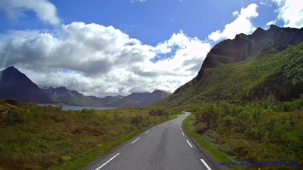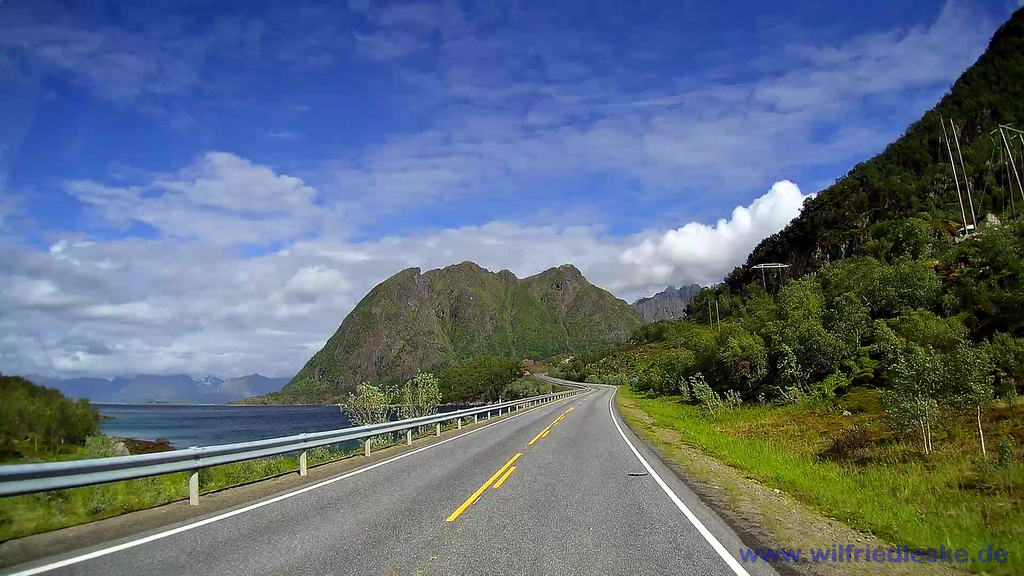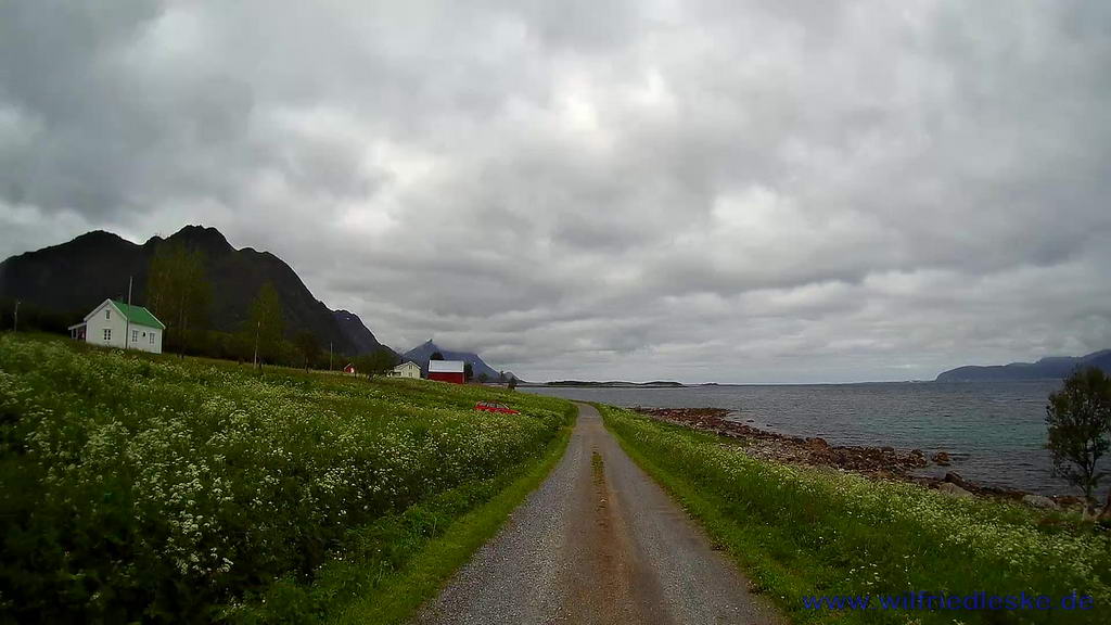 Wir überquerten die Raftsundbrücke und fuhren die E10 wieder zurück. Kurz danach verließen wir sie und fuhren am Myrlandstranda entlang. Hier hat man zwar eine schöne Aussicht, aber es gab kaum Parkmöglichkeiten. Überall Ferienhäuser und „Private“- Schilder. Aber der Abstecher über die Schotterpiste hat sich dennoch gelohnt. ![]()