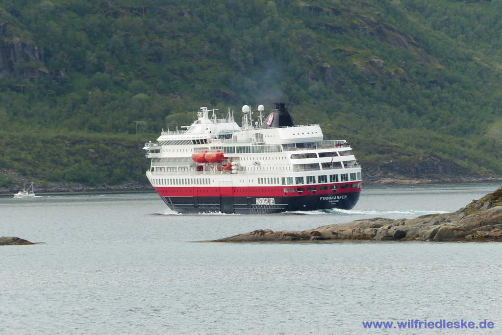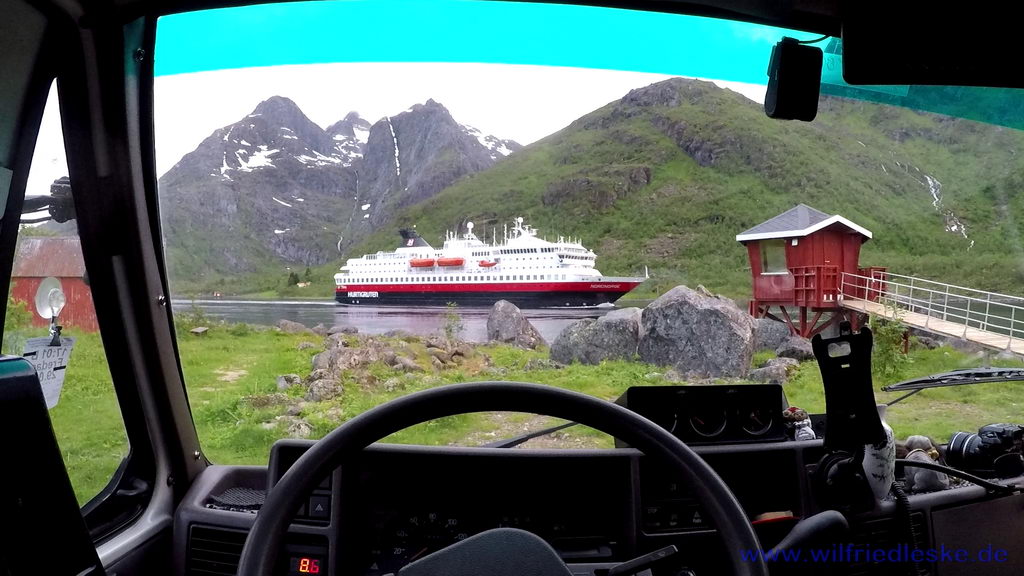 Nach der Wanderung fuhren wir noch etwas über die Insel, drehten dann aber doch um und suchten uns einen Parkplatz mit Blick auf die Zufahrt zum Trollfjord. Gegen 16:00 Uhr sollte hier das südwärts fahrende Hurtigruten- Schiff vorbeikommen. Es war schon beeindruckend, mit welcher Geschwindigkeit die „MS Finnmarken“ vor unseren Augen drehte um dann in den schmalen Trollfjord zu fahren.