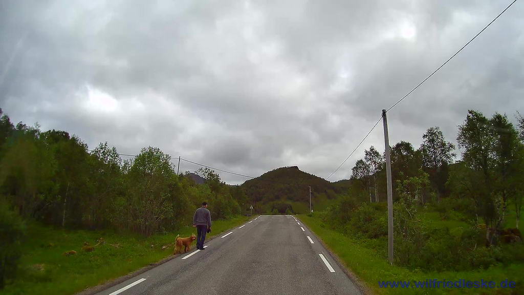 Ein Teil der alten Küstenstrasse war mittlerweile durch einen Tunnel ersetzt. So konnten wir die Straße am nächsten Morgen wunderbar für einen Spaziergang mit Amarok nutzen. Allerdings war der Wind immer noch so stark, dass man Angst hatte wegzufliegen. Wie wir später erfuhren, war der Fährverkehr an diesen Tagen komplett eingestellt. Da hatten wir ja Glück gehabt.